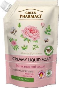 Tekuté mýdlo Green Pharmacy Pižmová růže a bavlna bylo vytvořeno pro jemné čištění a péči o pokožku vašich rukou. Tekuté mýdlo má příjemnou přírodní vůni a jemnou texturu, nevysušuje pokožku a nezanechává pocit pnutí.