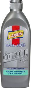 LARRIN NEREZ ČISTIČ, přípravek je vodní emulze tenzidů, organické kyseliny, abrazivních, leštících a pomocných přísad. Je určen k čištění dřezů, nádobí, příborů, žehliček a jiných výrobků z nerezavějící oceli a chromovaných předmětů.
